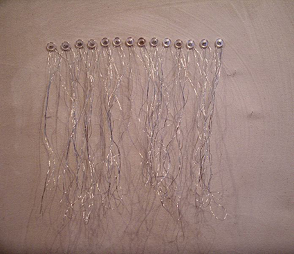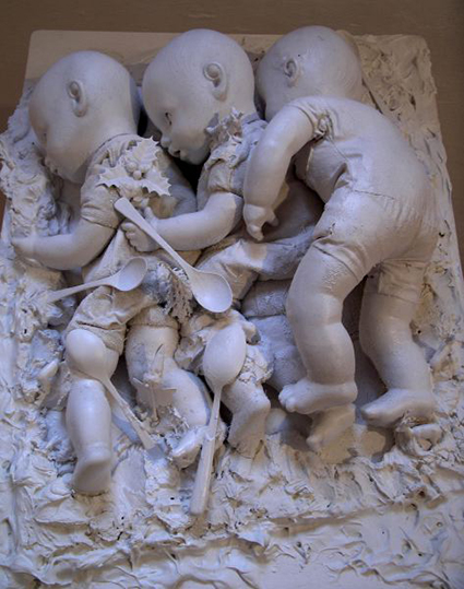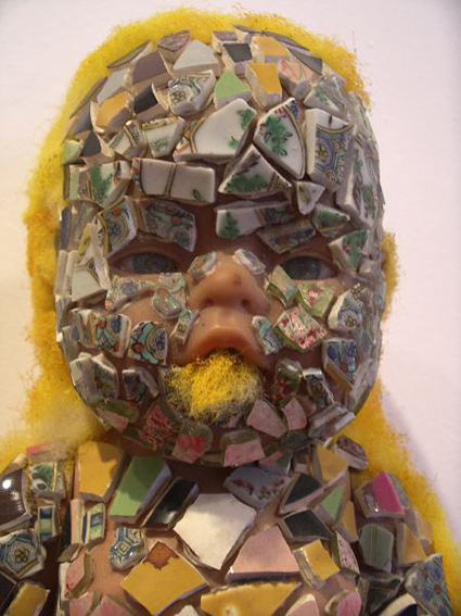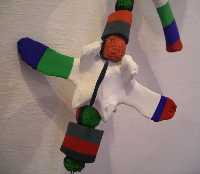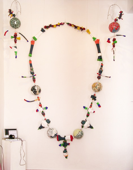 Régine Azéma travaille sur les os (des restes du vivant...). La couleur qui les enveloppe, tel un voile vif et joyeux, en gomme l'aspect morbide. Ainsi est tentée une évocation d'un personnage féminin mythique et présent dans les contes pour enfants: l'OGRESSE. C'est un retour vers le petit enfant que nous avons été, avec ses souvenirs, ses histoires, ses fantasmes, ses terreurs et son imaginaire. . |