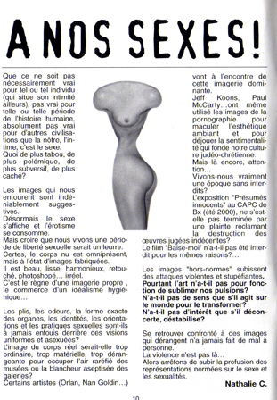 Vivons-nous vraiment une époque sans interdits? L'exposition "Présumés innocents" au CAPC de Bordeaux (été 2000), ne s'est-elle pas terminée par une plainte réclamant la destruction des oeuvres jugées indécentes? Le film "Baise-moi" n'a-t-il pas été interdit pour les mêmes raisons?... |