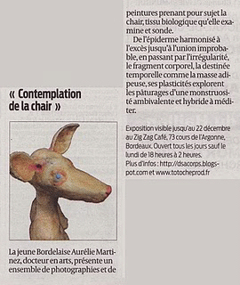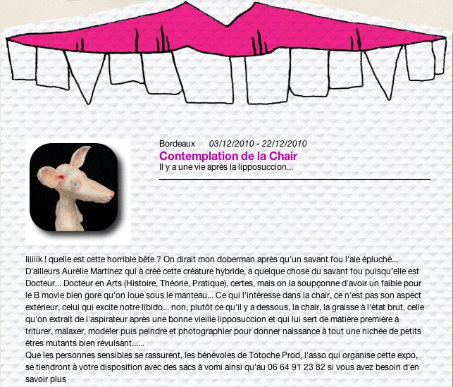 Pour sa première exposition personnelle, Aurélie Martinez, Docteur en Arts (Histoire, Théorie, Pratique), affirme sa fascination pour la chair qu'elle palpe, contemple,photographie, filme et peint. Sous cet épiderme, Aurélie Martinez examine la graisse ou l'anatomie interne du corps. |